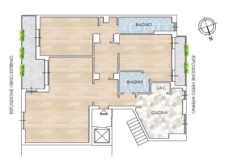 L'appartamento si trova al secondo piano ed è così composto: ingresso, ampia sala con zona pranzo e zona conversazione, ampia camera singola con bagno privato, suite matrimoniale con zona guardaroba e bagno privato, cucina abitabile con zona lavanderia, due balconi, cantina attrezzata.