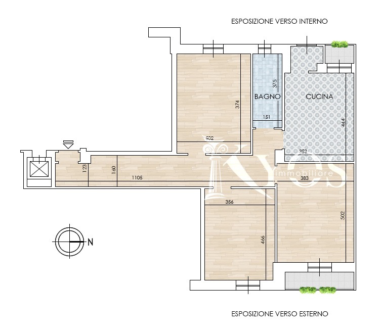 L’ingresso introduce a un corridoio centrale che disimpegna tutti gli ambienti della casa. La zona giorno è composta da un soggiorno con cucina separata di generose dimensioni e con accesso al primo balcone, mentre la zona notte ospita due camere da letto, entrambe di taglio matrimoniale. Completano la proprietà un bagno finestrato, un secondo balcone e una cantina di pertinenza. In un’ottica di riorganizzazione degli spazi interni, l’attuale distribuzione consente di rinunciare alla cucina abitabile a vantaggio della zona notte trasformando quindi l'unità in un quattro locali.