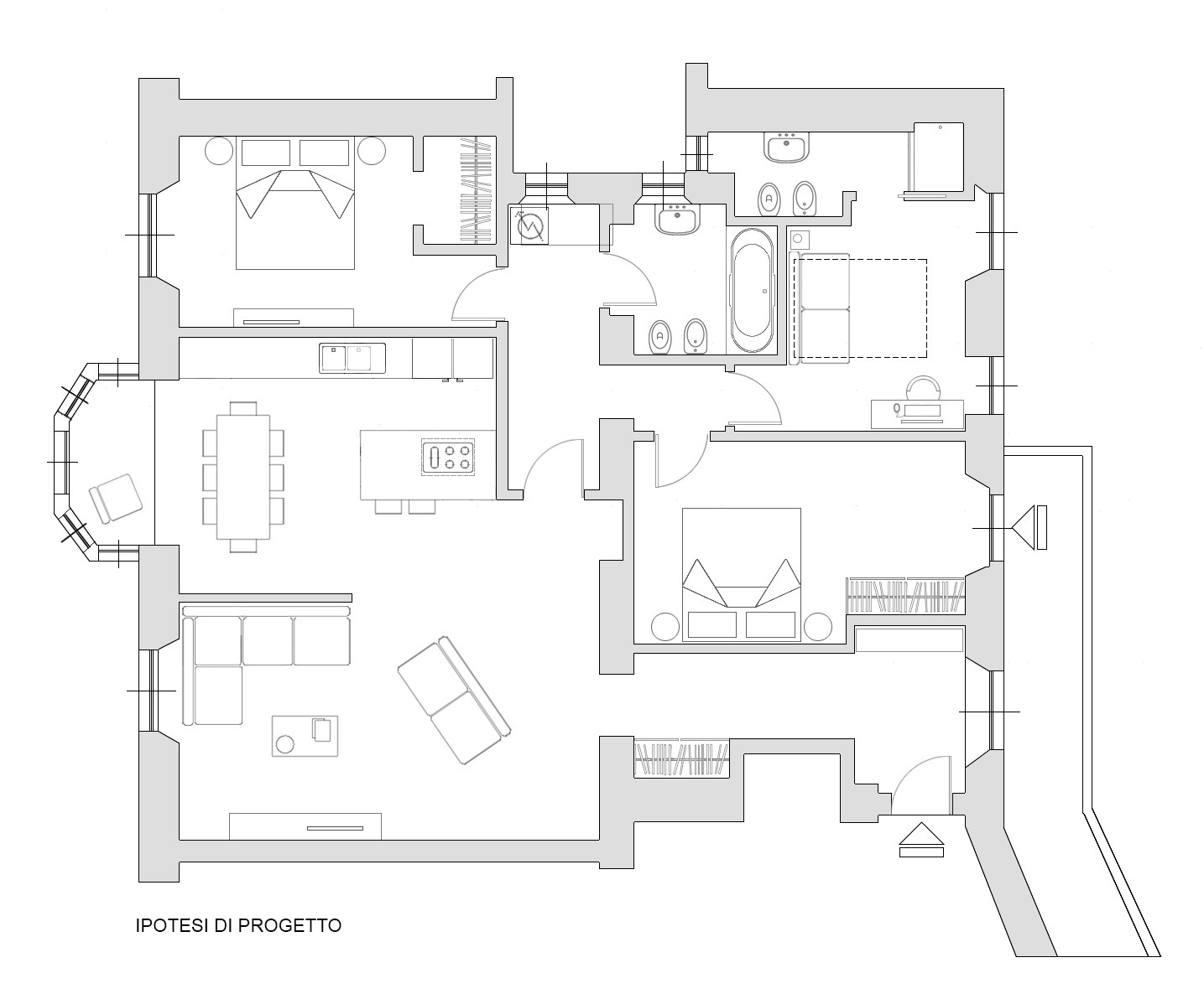 L’abitazione accoglie con un’atmosfera calda e raffinata. L’ingresso principale introduce a una luminosa zona giorno composta da un ampio soggiorno e una sala da pranzo impreziositi da un raffinato bow window che regala una splendida cornice. La cucina gode di accesso diretto alla balconata e il tinello adiacente ne amplia la vivibilità quotidiana. La zona notte ospita due camere, di cui una matrimoniale con cabina armadio e una singola, oltre a due bagni ben distribuiti. Completano la proprietà una cantina e un solaio di pertinenza.